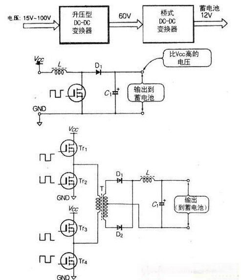 這是面向槳葉直徑達2m的風力發電機充電電路。風力發電機輸出電壓為15V一100V,對如此懸殊的輸入電壓范圍,采用了上圖的電路結構。在風力發電機輸出電壓低時,用斬波型升壓電路(中圖)把電壓升至60V,再經全橋DC-DC變換器(下圖)轉換為蓄電池電壓。當發電機電壓在60V以上時,升壓電路不工作,直接由全橋變換器轉換風力發電機。