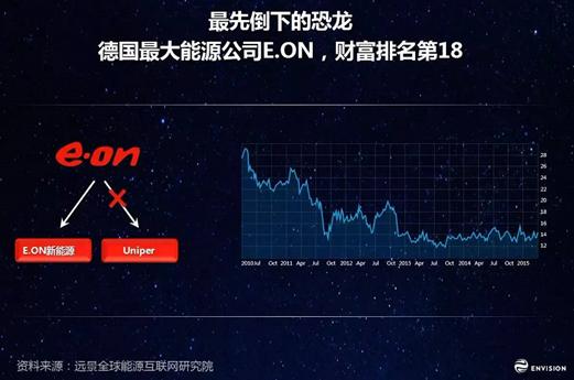 這些恐龍怎么樣了?在環境已經發生變化的德國,他最大能源公司E.ON是最先倒下的恐龍。E.ON在2014年年底就宣稱碰到了前所未有的挑戰,面對兩個能源世界,一個是傳統的能源世界;另外一個是嶄新的能源世界。在傳統的能源世界,他們非常沮喪,新投的幾億美元的天然氣電站,可能在一年時間也就只有十幾天可以帶負荷發電。在這么一個氣候已經變化的環境中,市場機制已經在篩選出一些物種。