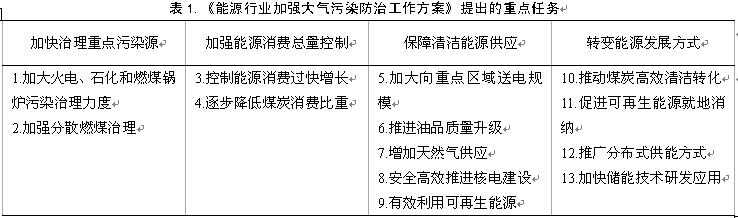 未來一個階段,我國能源發展的主攻方向是,向霧霾等污染宣戰、加強生態環保的節能減排措施,促進改善大氣質量。為落實國務院發布的《大氣污染防治行動計劃》,國家發改委、能源局和環保部聯合出臺了《能源行業加強大氣污染防治工作方案》(簡稱"方案"),確定了"加快治理重點污染源"等4個方面13項重點任務,見表1。