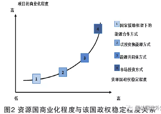 通過總結21世紀初中非四種常規能源外交方式,可以認為21世紀中非能源合作方式中,能源項目的商業化程度與非洲資源國政權的掌控力相關。資源國政權掌控力越強,社會成熟化程度越高,該國的能源項目商業化程度越高。資源國政府只有政權穩定,才有足夠的實力保障國家的社會穩定、維護政權的合法統治,才能進行國民經濟建設,制定合理的政策法規吸引外資,建設本國能源工業體系。通過上文對21世紀中非能源合作方式的總結,可歸納出以下規律:通常采用國家援助框架下的能源合作方式的非洲資源國政權穩定程度最低,能源項目的商業化程度最弱,例如蘇丹;采用以投資換能源方式的非洲資源國穩定程度仍然較低,能源項目的商業化程度較弱,例如安哥拉;采用能源共同體方式的非洲資源國穩定程度較高,項目商業化程度較高;采用市場投資方式的非洲資源國最為穩定,能源項目的商業化程度最高。具體關系如圖2所示。