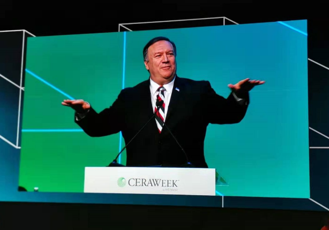 此外,能源周第二天下午,美國(guó)國(guó)務(wù)卿蓬佩奧現(xiàn)身并做主旨演講,并與主持人丹尼爾·耶金博士對(duì)話。蓬佩奧演講的核心是,美國(guó)要利用其在全球能源市場(chǎng)中地位的提升,來(lái)為其外交政策服務(wù)。蓬首先簡(jiǎn)要回顧了美國(guó)頁(yè)巖革命成功的歷程,并對(duì)其大加贊賞,指出其大大改善了美國(guó)能源地緣政治格局。“我們輸出油氣的背后是輸出美國(guó)的商業(yè)價(jià)值觀”,蓬如此強(qiáng)調(diào)。
