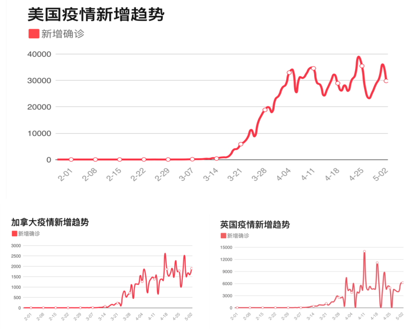 截止5月3日,英國經歷了3周左右上升+4周以上波動、至今每日新增數據依然在5000左右,加拿大經歷了3周左右上升+4周以上波動、至今每日新增數據依然在2000左右,而美國則經歷了4周左右上升+4周以上波動、至今每日新增確診數據更是保持在30000左右!這種類型的數據曲線,說明還遠遠沒有完成第一個關鍵的半衰期,未來走勢可能升、可能降、可能繼續波動僵持,遠遠談不上出現持續下降的拐點,疫情仍遙遙無期。
