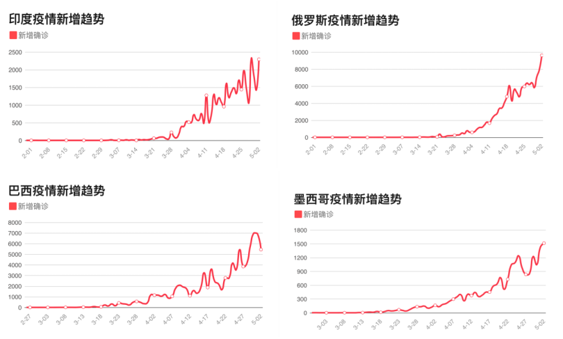 一是上升期的時間拉長但增速有所放緩,截止5月3日,印度、巴西、墨西哥、俄羅斯等新興市場大國的疫情已經持續增長長達5-7周,一方面他們可以借鑒前幾波國家的經驗教訓,但另一方面相關防疫能力仍難到位,因此雖然成功壓低了疫情爆發的曲線斜率,但卻也難以完全阻止數據的增長勢頭。
