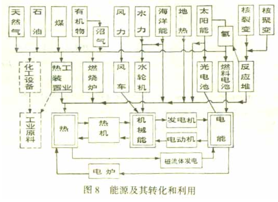 圖8表示各種能源經過各種設備把它們轉化為各種不同形式的能來使用。圖的左邊是各種能源,右邊是各種使用形式,中間是各種轉化過程。從上面往下,天然氣、石油、煤、有機物(如薪炭、農作物秸稈)都是常規能源,水力和風力也算是常規能源。