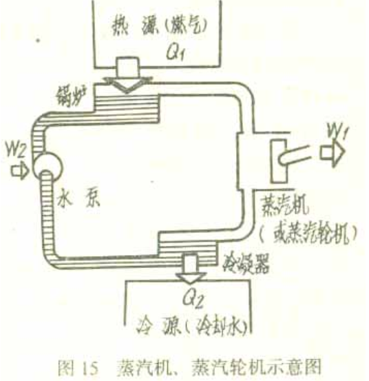 圖15是十八世紀末才趨于完善的人類發明創造的第一種熱機——蒸汽機的示意圖。煤或其它燃料,在鍋爐中燃燒后產生高溫燃氣傳熱給水,獲得具有一定壓力和溫度的蒸汽。蒸汽進入氣缸,在膨脹過程中,推動活塞,再通過連桿、轉動曲柄軸,輸出機械功。膨脹后蒸汽的壓力和溫度降低,在冷凝器中凝結成水,再用水泵打回到鍋爐中。這樣構成了可以不斷重復進行的循環過程,稱為熱力學循環。水或蒸汽在蒸汽機裝置中,經過高溫燃氣對它傳熱(Q)后,內能升高了。當它從高壓向低壓膨脹時,內能降低而對活塞輸出機械功(W)。水或蒸汽是蒸汽機使用的工作介質,叫做工質。我們把工質作為體系,如果考慮它進行了一個熱力學循環,回到原來的狀態,內能沒有變化(即△E=O),則W=W-W=Q=Q-Q這就是說,蒸汽機活塞的輸出功減去輸給水泵的功,恰好等于從燃氣傳給工質的熱量減去工質傳給冷卻水的熱量。
