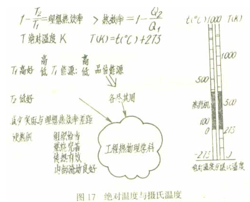 注意式中T是絕對溫度,不是攝氏溫度。在一個大氣壓下,水在0℃時結冰,在100℃時沸騰成蒸汽。絕對溫度的度數是攝氏溫度加上273,所以它的零度是-273℃(見圖17)。計算上式時,攝氏溫度要換算成絕對溫度。T高,即能源產生蒸汽的溫度高,叫作高品位能源,這也就是高品位的含義。