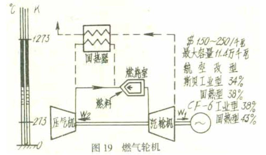圖19表示一個不帶回熱器或者帶有回熱器的燃氣輪機的示意圖。上邊講了,空氣先通過壓氣機,提高壓力,再到燃燒室,提高溫度,最后到氣輪機膨脹輸出功,它的工作溫度范圍表示在左邊的溫度圖上。