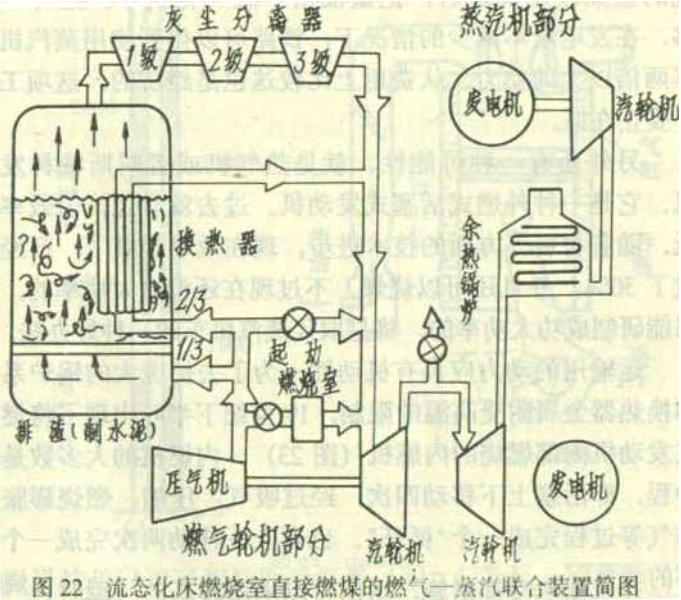 這種聯合裝置在發電上已大力發展。因為燃氣輪機可以在高溫下使用,它是在機內燃燒,與蒸汽輪機不一樣,對氣輪機葉片采取冷卻措施,可以耐受高的溫度,在1000℃以上的高溫下工作。它的排氣溫度為500~600℃,也比較高,正好可以到余熱鍋爐中去產生蒸汽,帶動蒸汽輪機工作,蒸汽最后在冷凝器中以接近大氣的溫度冷凝成水。因此它可以在1000℃與20~30℃的溫度范圍內工作,所以熱效率高。目前聯合循環發電效率已經超過46%,是一般蒸汽輪機做不到的。這是熱機發展的方向。在國外這樣的聯合裝置,燃氣輪機燒的是天然氣或油,有的工業生產過程中就有副產品可燃氣體,可以用作這種裝置的燃料。我國發電全要燒煤。目前國外正在大力研究兩種燒煤的辦法:一種是流態化床燃燒室(見圖22),另一種是把煤氣化后,送到燃燒室里燃燒。