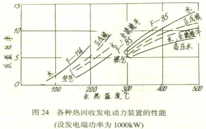 工業余能的利用,是個大問題。我國工業耗能約占全國總能耗的三分之二,而利用效率低,大量余能白白丟掉了,今后應該好好利用起來。余能利用的辦法與它的品位很有關系,前面介紹熱力學第二定律,已經提到能源品位的高低對熱機熱效率的影響。例如有高溫的廢氣,溫度甚至高到1000℃以上,如果氣體壓力也比較高,那就很好利用,把它通過一個膨脹氣輪機(例如煙氣輪機),高溫高壓的氣體就可以膨脹作功。高爐煤氣、焦爐煤氣、化工工業中都有兩個大氣壓上下的高溫氣體,過去是浪費掉了,現在裝上一個煙氣輪機,就可以很好利用這個能量了。但是如果高溫氣體壓力只是略大于大氣壓,就不能膨脹作功,只能作為一個熱源來使用,用在封閉式的氣輪機上,或者用來產生蒸汽通過汽輪機發電。假如余氣的溫度低,只有300℃左右,則需應用有機工質的蒸汽循環(圖24),勉強還可以使用。從熱力學第二定律就可以看出熱效率會很低(目前不會超過8%),而設備投資比較大,回收投資的年數也就多了。要比較用熱機來發電,還是用來產生工業上或者生活供暖上所需要的低溫蒸汽,或熱水那一個更為合算。