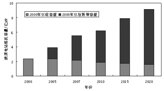 三、中國(guó)能源的出路除了加速發(fā)展核能與可再生能源,最重要的方面是要努力探索煤炭利用的可持續(xù)發(fā)展,以及積極發(fā)展現(xiàn)代化的煤炭利用技術(shù)(非直接燃燒方式)。發(fā)展以煤(或石油焦)氣化為核心的多聯(lián)產(chǎn)——通過煤(或焦炭)氣化和化工反應(yīng)一次通過方式實(shí)現(xiàn)電力、液體燃料、化工產(chǎn)品、供熱、合成氣的聯(lián)產(chǎn),是解決我國(guó)能源、環(huán)境、液體燃料短缺等重要問題的戰(zhàn)略方向。圖3是對(duì)我國(guó)燃煤電站裝機(jī)容量的預(yù)測(cè)(2000-2007數(shù)據(jù)來源于[2]、[3]、[4]),自2000以后燃煤電站的增量增勢(shì)顯著,在增量中必須有相當(dāng)大的比例是多聯(lián)產(chǎn)。若按照燃煤電站的現(xiàn)有技術(shù)發(fā)展,將來技術(shù)路線鎖定,需要花費(fèi)更大的代價(jià)來扭轉(zhuǎn)局面。因此,實(shí)施以煤氣化為核心的多聯(lián)產(chǎn)戰(zhàn)略刻不容緩。