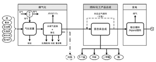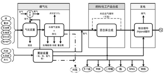 圖4是對(duì)我國(guó)多聯(lián)產(chǎn)系統(tǒng)的簡(jiǎn)單闡釋。煤經(jīng)氣化后得到合成氣(CO+H2),凈化以后可用于生產(chǎn)化工原料、液體燃料(合成油、甲醇、二甲醚等)和電力。多聯(lián)產(chǎn)將動(dòng)力與化工過程按最優(yōu)原則有機(jī)地耦合,聯(lián)產(chǎn)高附加值液體燃料,降低了產(chǎn)品成本,同時(shí)簡(jiǎn)化系統(tǒng),從而降低投資和運(yùn)行成本,提高系統(tǒng)經(jīng)濟(jì)性和可靠性,在節(jié)能減排上有顯著的效益。這種多聯(lián)產(chǎn)系統(tǒng)在化工產(chǎn)品、液體燃料和電力之間可以按市場(chǎng)需求或是發(fā)電的“峰-谷”差進(jìn)行適當(dāng)調(diào)節(jié),有很好的靈活性。