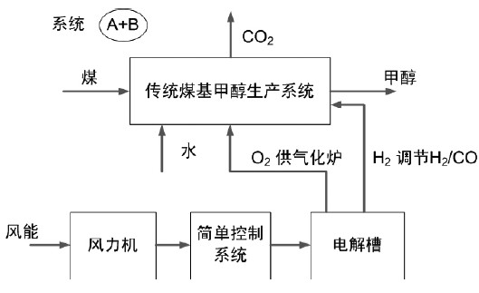根據(jù)上述廣義能源系統(tǒng)利用的原理,可再生能源必須與化石能源集成利用,如生物質(zhì)和煤的混燒、太陽能加熱火力發(fā)電廠的鍋爐給水、風(fēng)能和煤化工的集成等,均為目前可再生能源的發(fā)展找到較“合適的位置”。下面以風(fēng)能和甲醇生產(chǎn)集成的系統(tǒng)為例說明廣義能源系統(tǒng)的具體體現(xiàn)。