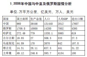 中國國土面積960萬平方公里,居世界第三,人口13.1448億人。2006年,實現生產總值26446億美元,增長11.1%,列全球第四。人均GDP2012美元。當年實現對外貿易額17607億美元,其中出口9691億美元,進口7916億美元;2006年與中亞及俄羅斯454.4億美元,占當年外貿總值的2.6%。當年外匯儲備10663億美元,為全球第一。2007年,實現生產總值32419億美元,增長11.4%,列全球第四。人均GDP2466美元。當年實現對外貿易額21738億美元,其中出口12180億美元,進口9558億美元;2007年與中亞及俄羅斯678.2億美元,占當年外貿總值的3.1%。當年外匯儲備15282.5億美元,為全球第一。