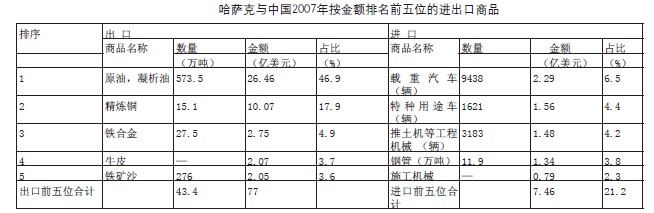 2007年中國是哈薩克第二大貿易伙伴,第三大出口國和第二大進口國。