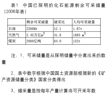 中國能源資源即使按已探明的剩余可采儲量的儲采比,石油為12.1,天然氣為41.8,煤炭為84。見下表。