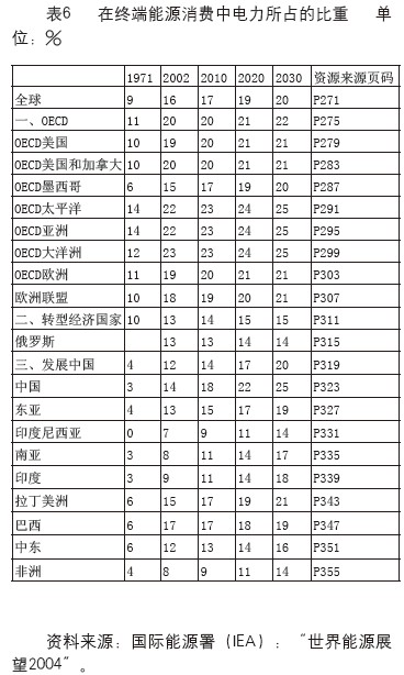 從全球分地區的終端能源消費中2030年電力比重來看,經濟合作與展望組織國家(OECD)即發達國家為22%,轉型經濟國家為15%,發展中國家為20%。按國別分:美國和加拿大為21%,俄羅斯14%,中國25%,印度尼西亞14%,印度18%,巴西19%。中國是最高的,中國2030年在能源終端消費中電力的比重為25%,如果扣除生物質能源和廢料的影響,電力所占的比重為28.3%,與電力占終端能源消費為主的差距也是很大的。具體數據見表6。