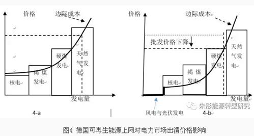 與化石燃料發電廠相比,風電和太陽能發電的特點是高投資成本、低運營成本和零燃料成本,其發電邊際成本接近于零。當可再生能源進入電力市場,由于可再生能源發電邊際成本最低(接近于零),加上法律規定電網優先全額收購,因此首先是可再生能源電力進入市場,然后才是核電、煤電通過競價進入市場滿足電力需求。在這種情況下,邊際成本更高的天然氣發電,甚至部分煤電就被排除在市場之外。電力市場供應曲線(邊際成本線)右移、結算價格下移,導致結算價格下跌(圖4-b)。