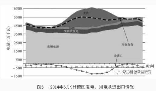 最后,利用鄰國電網消納德國光伏發電的波動性,以維持電網平衡。目前來看,這一方式似乎是德國在應對短期光伏出力大幅波動的最主要方式。這里,以2014年6月9日德國光伏發電出力超過系統50%那一天情況為例加以說明。