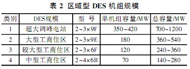 根據(jù)目前正在規(guī)劃和建設(shè)的若干項目的情況分析,適合于上述中國區(qū)域型DES/CCHP的基本模式和經(jīng)濟輸送距離,能夠把工業(yè)和商住用能集成在一起,盡可能實現(xiàn)冷、熱、電、汽聯(lián)供的區(qū)域面積大致在10km2的量級。規(guī)劃的通用步驟,一是按照人口和產(chǎn)業(yè)需求規(guī)劃一個適宜規(guī)模的天然氣DES電站;按照居住人口分布,規(guī)劃若干個熱水站。二是按照公共建筑包括工業(yè)廠房空調(diào)制冷和供暖負荷的空間分布,規(guī)劃若干個集中供冷(暖)站DCS(DHS)。三是根據(jù)工業(yè)蒸汽負荷的需求時間特性規(guī)劃聯(lián)供方案:16h/d運行的、在經(jīng)濟輸送距離內(nèi)的可由電站抽凝式汽輪機同步供應(yīng);24h/d運行的,原則上把用戶集成起來,構(gòu)建一個適當規(guī)模的24h/d連續(xù)運行的DES/CCHP子系統(tǒng)。適合于這樣的區(qū)域型DES機組的規(guī)模見表2。