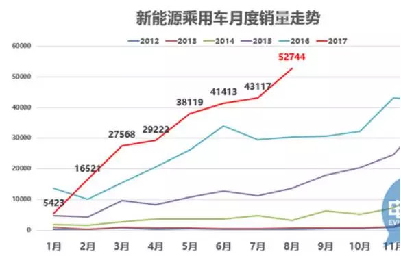 據(jù)乘聯(lián)會(huì)的數(shù)據(jù),2017年8月新能源乘用車(chē)銷(xiāo)量創(chuàng)有史以來(lái)單月銷(xiāo)量新高,達(dá)到52744臺(tái),環(huán)比7月增長(zhǎng)1萬(wàn)臺(tái),同比增速72%。