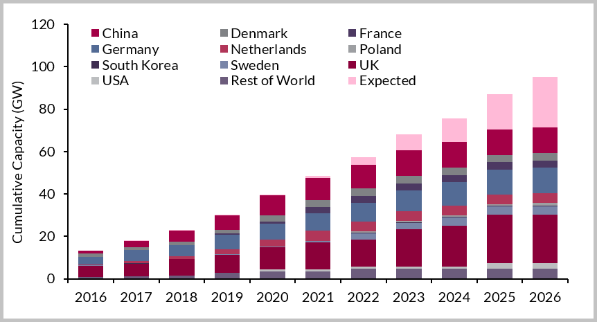 2017年,全球累計(jì)海上風(fēng)電裝機(jī)容量約為17.8吉瓦,預(yù)計(jì)到2026年這一數(shù)據(jù)將增至95.2吉瓦。