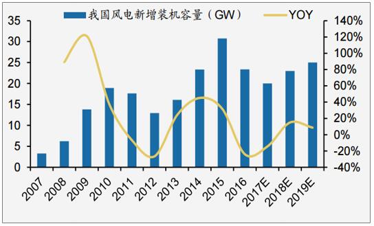 截至2016年底,我國已核準未建設風電項目容量合計78GW;2017年7 月國家能源局《2017-2020年風電新增建設規模方案》提出2017年新增建設規模30.65GW; 2017年上半年,國內風電新增并網容量6.01MW,預計全年在17GW。
