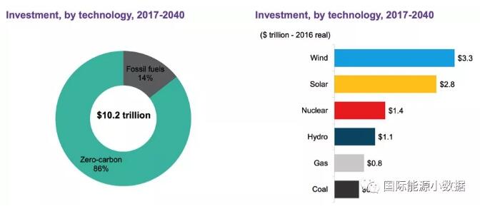 巨額的資金正在流向可再生能源的開發。根據彭博新能源財經的數據,2017-2040年全球新增電力裝機投資將達10.2萬億美元,其中86%用于可再生能源發電裝機。
