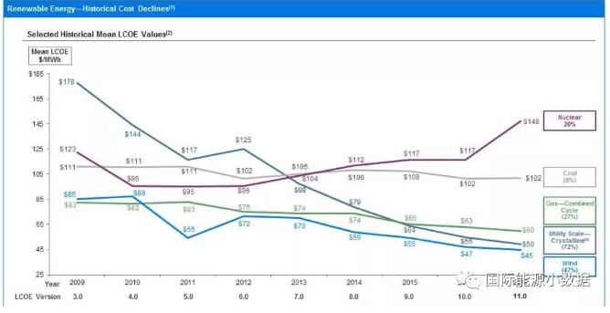 可再生能源一直被認為是“昂貴”的能源,但是事情正在起變化。以美國為例,Lazard公司的數據表明,風電(4.5美分/千瓦時)、太陽能光伏(5.0美分/千瓦時)度電成本已經低于天然氣發電(聯合循環發電6美分/千瓦時),大大低于煤電(10美分/千瓦時)。
