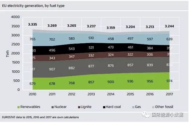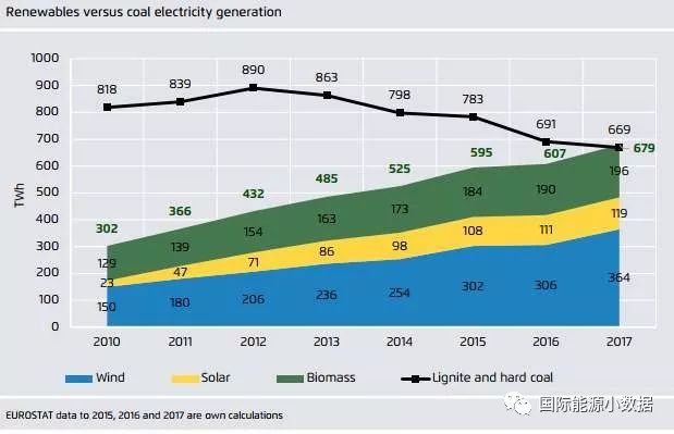 如果在可再生能源中不計水電,2017年歐盟風電、生物質和太陽能發電量(679TWh)在歷史上首次超過了煤電(669TWh)。