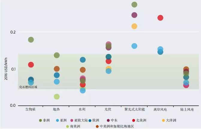 在可再生能源資源具備經(jīng)濟(jì)性的未開(kāi)發(fā)地區(qū),生物質(zhì)能、水電和陸上風(fēng)能都能提供低成本的電力。太陽(yáng)能光伏發(fā)電(PV)、海上風(fēng)電和聚光式太陽(yáng)能發(fā)電(CSP)的電力成本也在近期快速下降。這意味著無(wú)論是現(xiàn)在還是未來(lái)幾年,當(dāng)這些可再生能源電站投入運(yùn)行時(shí),可再生能源技術(shù)可以提供有競(jìng)爭(zhēng)力的電力。