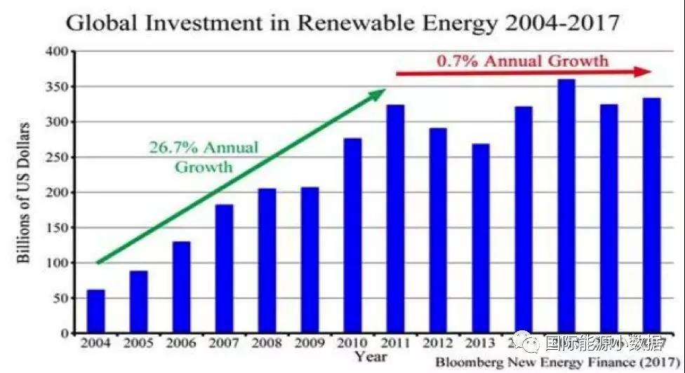 根據(jù)彭博新能源財(cái)經(jīng)的數(shù)字,2004年到2011年間全球可再生能源投資年增長(zhǎng)率為26.7%。然而,2011年到2017年間全球可再生能源投資增長(zhǎng)率僅為0.7%。2017年日本可再生能源投資下降16%、印度下降20%、德國(guó)下降26%、英國(guó)下降56%。美國(guó)小幅增長(zhǎng)1%,而中國(guó)大增30%(1330億美元)。可以說,如果不是因?yàn)橹袊?guó)的巨大貢獻(xiàn),全球的可再生能源投資其實(shí)是在下降的。