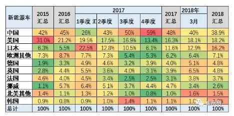 2018年1- 3月份,中國純電動乘用車的份額達到49%,較17年的1-3月份的42%份額大幅提升7個百分點。18年1到3月份,美國和法國德國等的新能源車市場份額同比都有所下降,而亞洲市場的日本和韓國的純電動車份額都有較好提升。