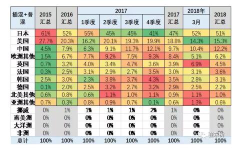 日本依靠普混優勢較為突出,在17年到18年日本在普混和插混的共同份額保持在50%水平份額,。