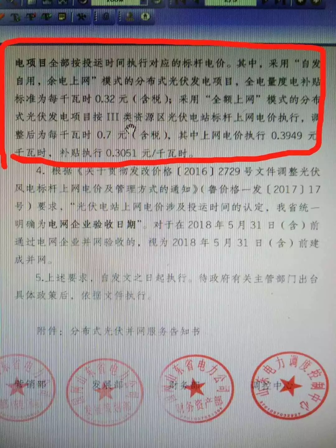 4.根據《關于貫徹發改價格[2016]2729號文件調整光伏風電標桿上網電價及管理方式的通知》(魯價格一發[2017]17號)要求,“光伏電站上網電價涉及投運時間的認定,我省統一明確為電網企業驗收日期”。對于在2018年5月31日(含)前通過電網企業并網驗收的,視為2018年5月31日(含)前建成并網。