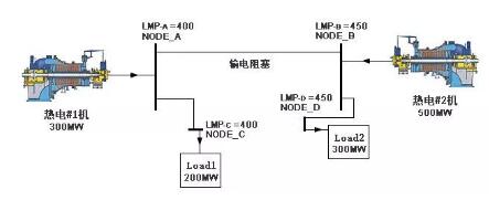 以簡單的4節點系統為例:熱電#1機、熱電#2機最大發電能力分別為300MW和500MW;NODE_A與NODE_B之間存在輸電阻塞;LMP_a= LMP_c =400;LMP_b= LMP_d =450;