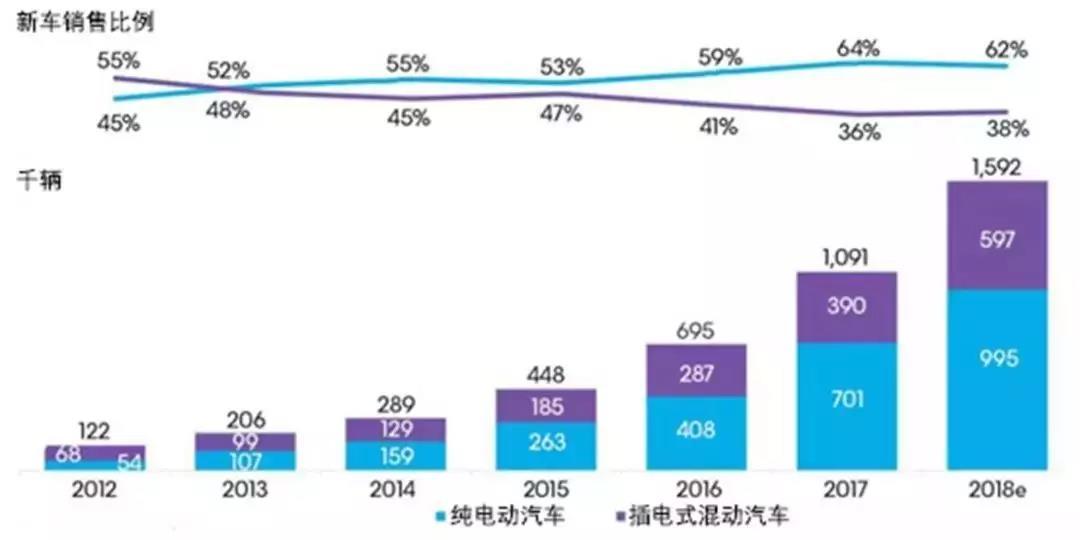 圖1為2012年至2018年全球不同類型乘用電動(dòng)汽車銷量及預(yù)測(cè)。