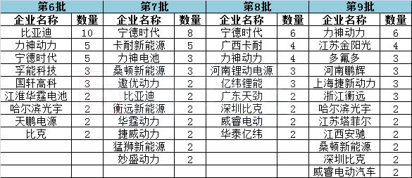 高工電動車網統計第5-9批目錄了解到,寧德時代、力神等電池企業在每批目錄中配套車型數量均位居前列,且配套的車企覆蓋較為廣泛。例如,寧德時代不僅為北汽等自主品牌以及威馬等新造車企業提供配套,還為華晨寶馬、北京現代、東風日產等諸多合資品牌提供配套。