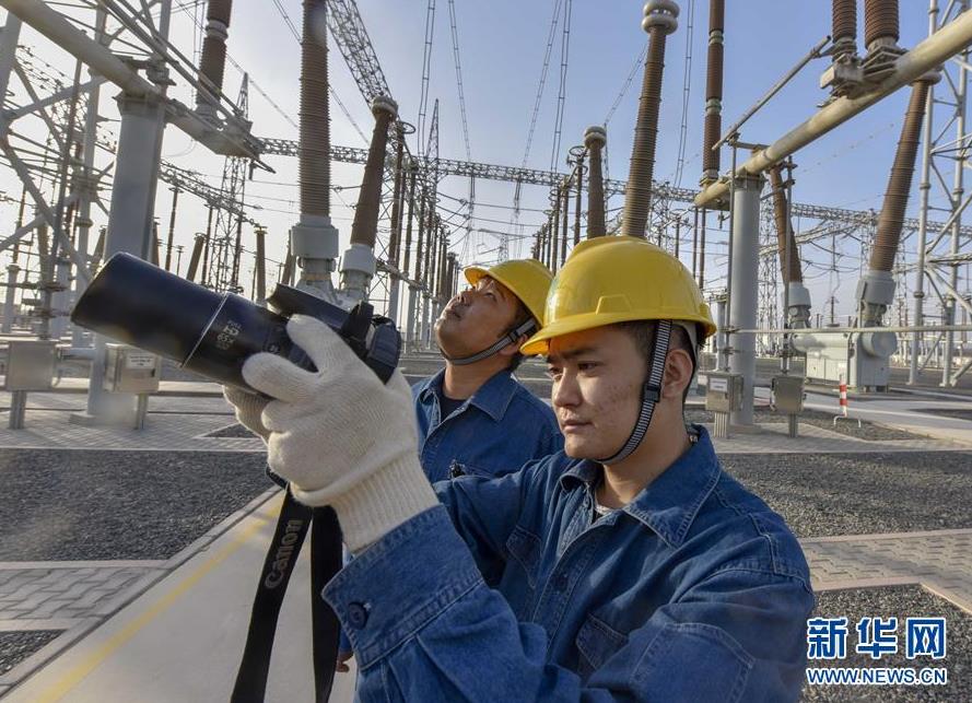在吐魯番市750千伏變電站,兩位工作人員利用專用設備對電力設施進行檢查(9月18日攝)。新華社記者趙戈 攝