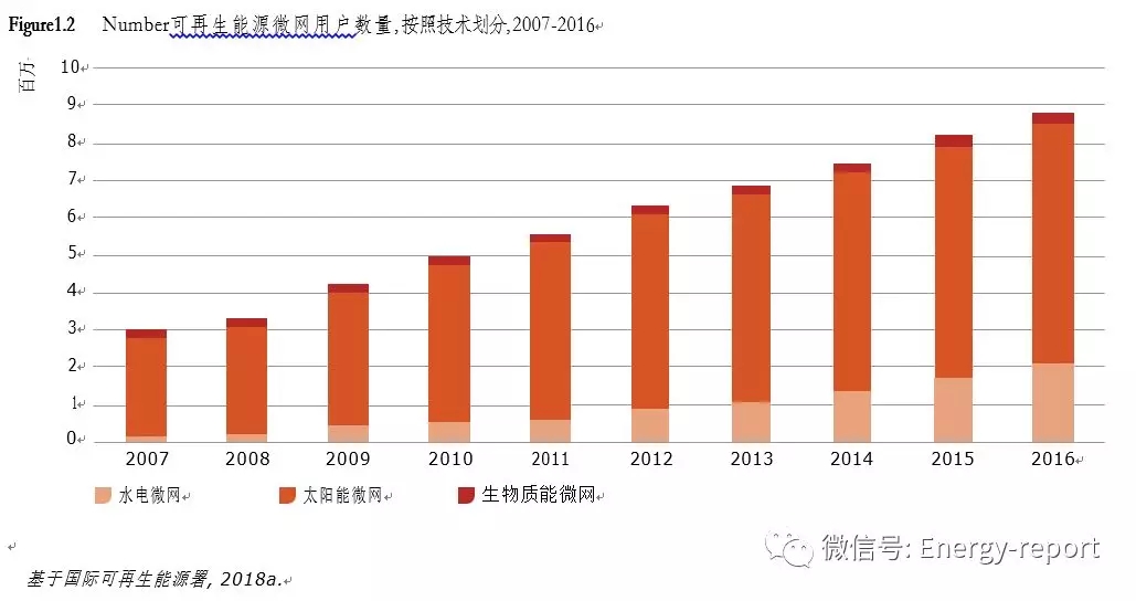 在過去十年中,可再生能源微電網(wǎng)的數(shù)量穩(wěn)步增長? 小型水電微電網(wǎng)是最廣泛應(yīng)用的,將大多數(shù)終端用戶連接到微電網(wǎng)中(圖1.2)?由于成本的快速降低和技術(shù)的大幅改進,太陽能光伏(PV)最近得到了迅猛增長,從2008年的11兆瓦容量增加到2017年的308兆瓦?