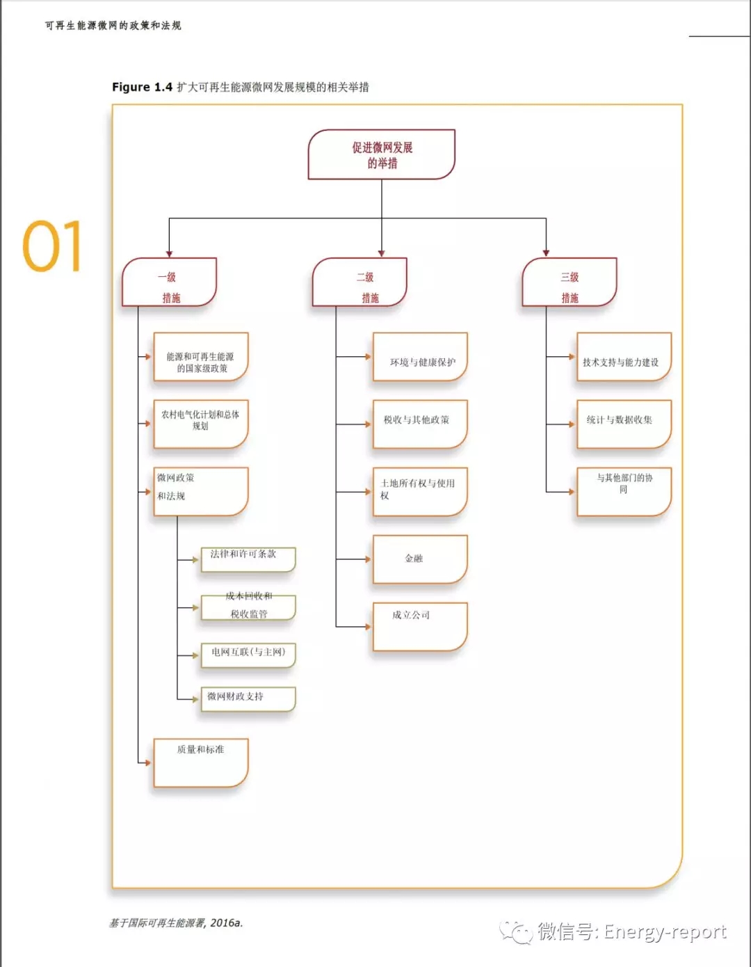 1.一級措施與國家能源框架有著內(nèi)在的聯(lián)系,并且仍然屬于能源事務(wù)部門授權(quán)的公共機構(gòu)的職權(quán)范圍,例如能源部? 其中包括與電力部門相關(guān)的政策和法規(guī),農(nóng)村電氣化計劃,監(jiān)管框架,質(zhì)量標準以及為微電網(wǎng)項目提供的直接財政支持?