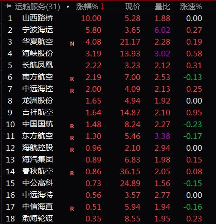 油價(jià)的下跌直接利好交通運(yùn)輸行業(yè),特別是航空運(yùn)輸板塊,截至收盤,山西路橋(5.280, 0.48, 10.00%)漲停,寧波海運(yùn)(3.650, 0.20, 5.80%)漲幅近6%,華夏航空漲4.08%,南方航空漲逾2%,東方航空、中國(guó)國(guó)航、吉祥航空等漲幅超1%。