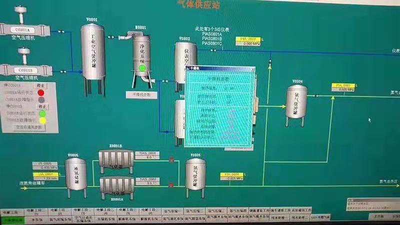 生產監控方面,水電解制氫裝置采用PLC全自動控制,PLC通過系統中裝配的各類傳感器,實時監控制氫系統工作時的壓力、溫度、液位、電解電壓、電解電流、閥位狀態等參數,并針對各個指標設置報警值和軟連鎖值;針對關鍵參數如壓力、液位等參數設置機械式硬連鎖儀表及元件,以避免在系統突然斷電或PLC控制系統失控時發生危險。在水電解制氫裝置中設置氧中氫含量和氫中氧含量在線分析儀,并設置氧中氫和氫中氧含量超量報警裝置,如達到超量極限,則連鎖關機。設氫氣檢漏報警裝置,并與相應的排風機聯鎖,當空氣中氫氣濃度達到0.4%(體積比)時,排風機立即自動開啟。