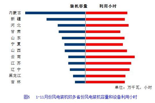 分類型看,1-11月份,全國水電設備平均利用小時為3358小時,比上年同期增加60小時。在水電裝機容量超過1000萬千瓦的8個省份中,青海、云南、廣西和四川同比分別增加1474、311、132和11小時,湖南、廣東、湖北和貴州同比分別降低540、74、57和22小時;全國火電設備平均利用小時為3946小時(其中,燃煤發電設備平均利用小時4047小時),比上年同期增加175小時。分省份看,全國共有12個省份火電設備利用小時超過全國平均水平,其中江西、內蒙古、河北和安徽超過4500小時,寧夏、山東和江蘇超過4200小時,福建、海南、天津、湖北和陜西超過4000小時,而云南和西藏僅為1477和277小時。與上年同期相比,共有24個省份火電利用小時同比增加,其中,廣西增加717小時,福建、甘肅、湖北和湖南增加超過500小時,重慶、內蒙古、四川和安徽增加超過400小時,而青海降低1143小時,寧夏、江蘇、陜西和上海下降超過100小時,分別降低223、204、182和104小時。全國核電設備平均利用小時6791小時,比上年同期增加287小時;全國并網風電設備平均利用小時1891小時,比上年同期增加139小時;全國太陽能發電設備平均利用小時1148小時。