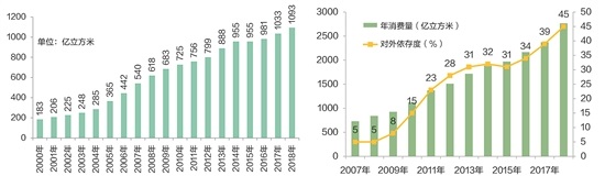 中國石油歷年天然氣產量增長圖 我國天然氣消費量和對外依存度變化圖