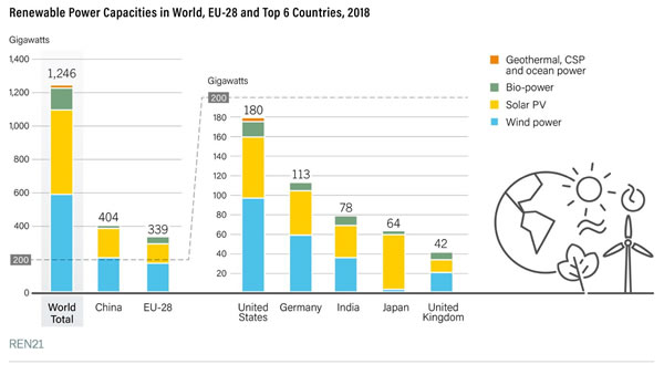 根據REN21匯總的數據,2018年底全球可再生能源裝機1246吉瓦,其中中國404吉瓦(占32.4%),其次是歐盟28國共有339吉瓦(27.2%)、美國180吉瓦(14.4%)、印度78吉瓦(6.3%)、日本64吉瓦(5.1%)。