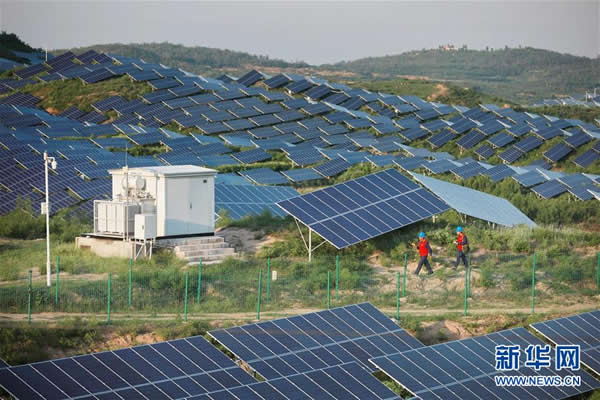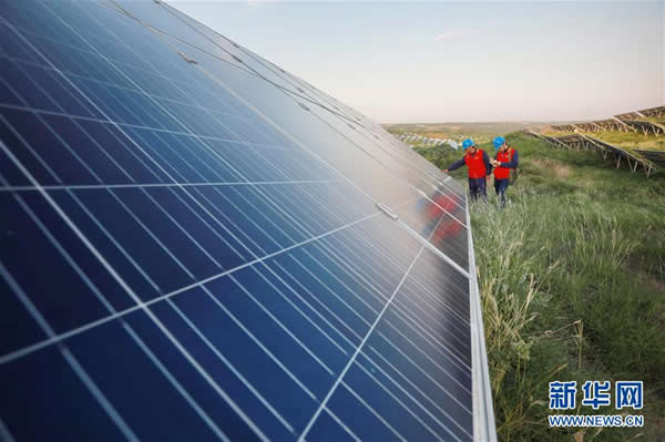 國網(wǎng)內(nèi)丘縣供電公司技術人員在內(nèi)丘縣柳林鎮(zhèn)虎頭山光伏電站內(nèi)巡檢(8月21日攝)。新華社記者 牟宇 攝