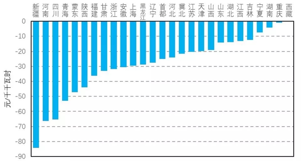 圖2 2018年各省交易電價較標(biāo)桿電價降幅排序(單位:元/千千瓦時)