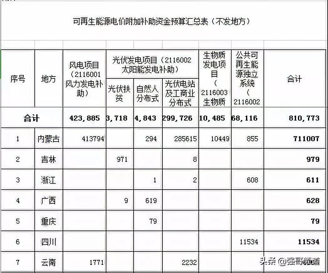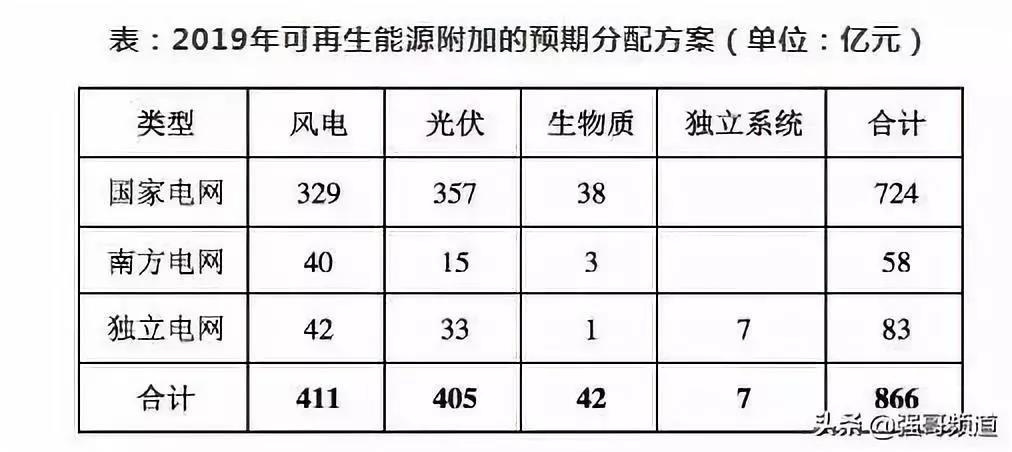 此前,據“國家可再生能源信息管理中心”的信息,2019年預期能收上來的866億元補貼,預期分配給光伏、風電、生物質、獨立系統的補貼額度分別為411億元、405億元、42億元和7億元,共計866億元。其中,預期分配給國家電網的補貼額度最高為724億元,預期分配給南方電網和獨立電網的補貼分別為58億元和83億元。