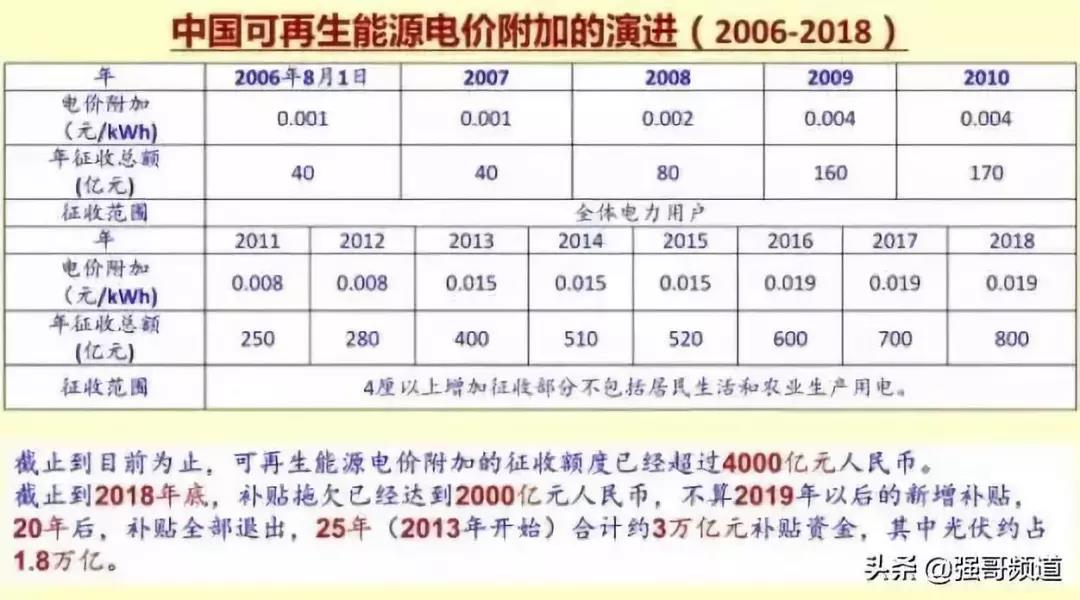 國家發改委能源研究所研究員王斯成測算,目前我國可再生能源電價附加的征收額度已超過4000億元人民幣。截至2018年底,補貼拖欠已達到2000億元人民幣,不包括2019年以后的新增補貼。20年后,補貼全部退出,從2013年算起25年合計約3萬億元補貼資金,其中光伏約占1.8萬億元。