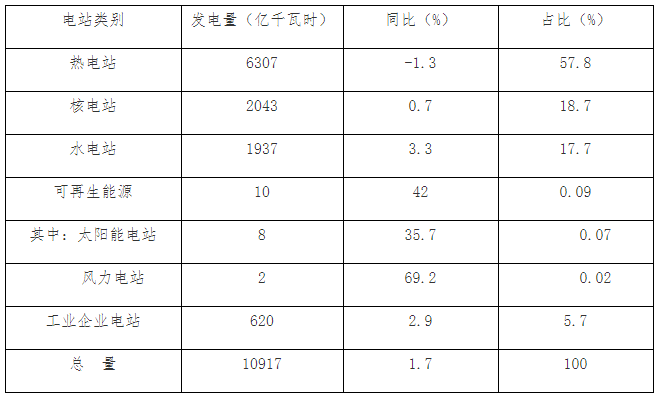 表二:2018年俄羅斯發電量分類統計表